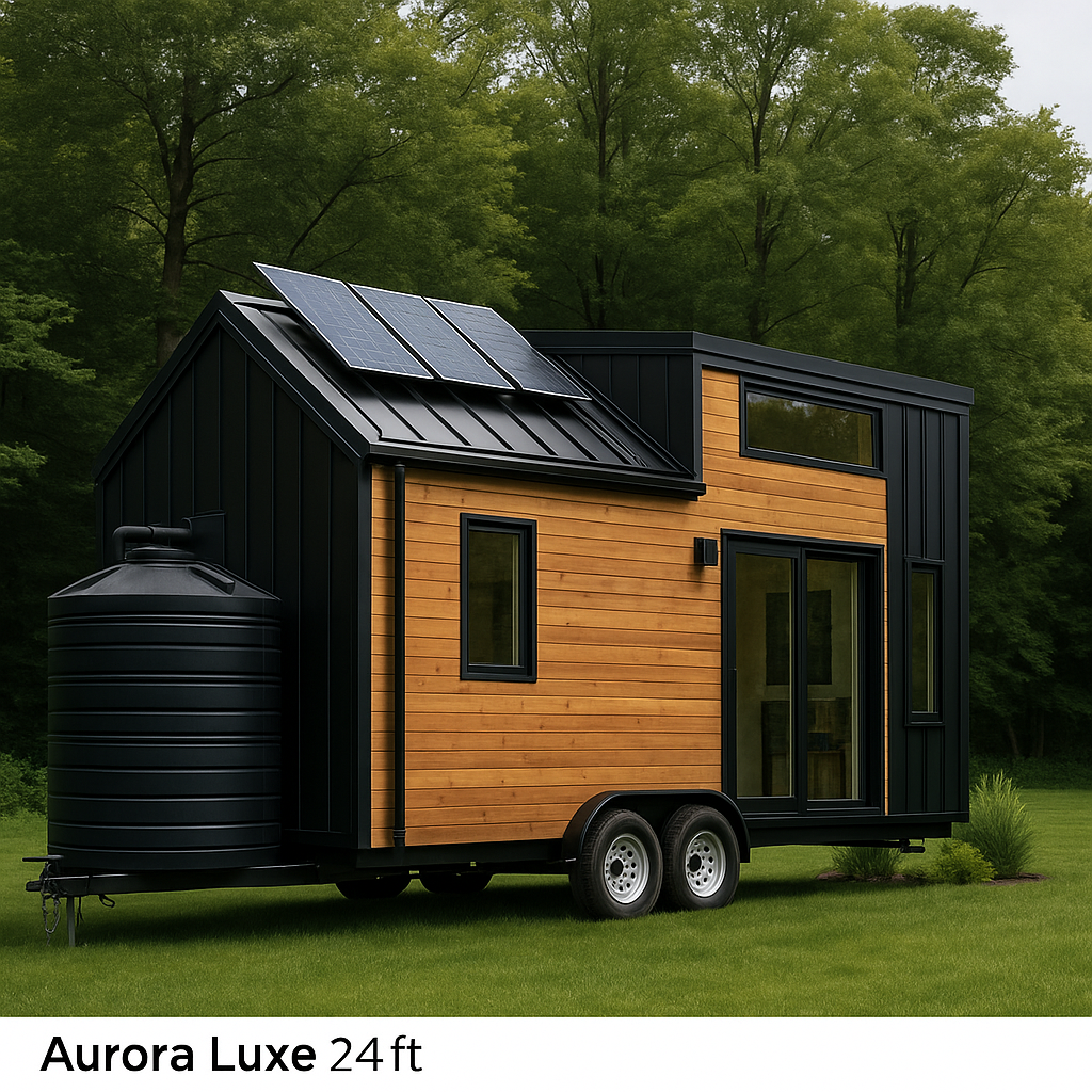 Sustainable meets sophisticated. The Aurora Luxe is a premium eco-tiny home with modern design, solar readiness, and built-in rainwater harvesting.